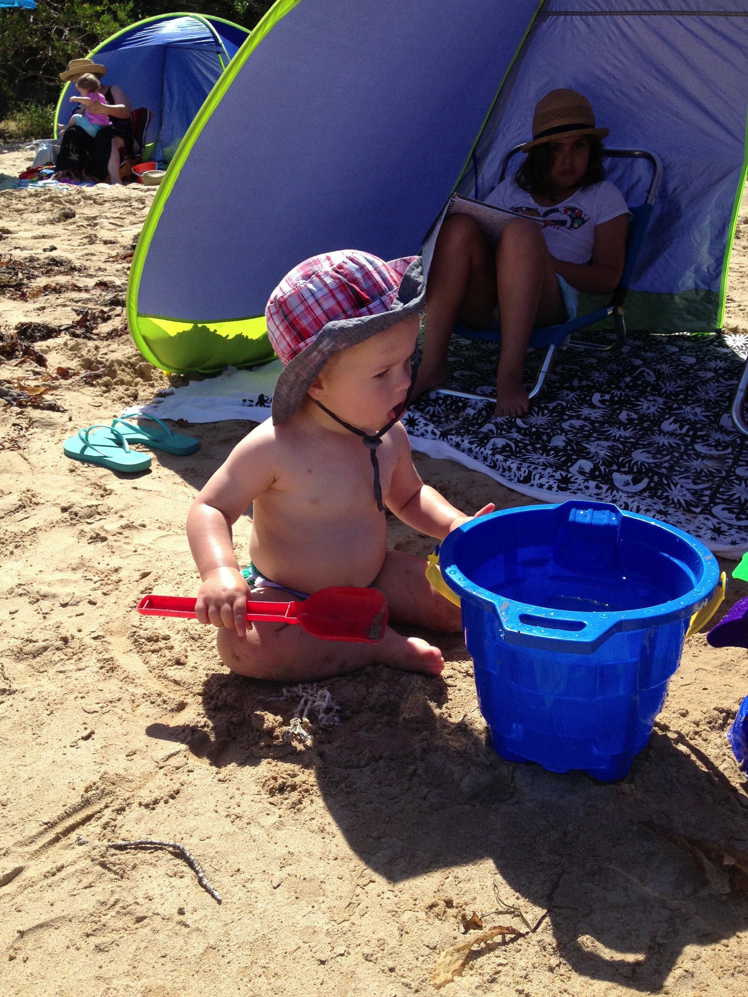 We opted for Harry not to wear his CIs on the beach as he was too busy crawling in and out of the surf. Next year we will try the aqua accessory bag and the Nammu sun hat