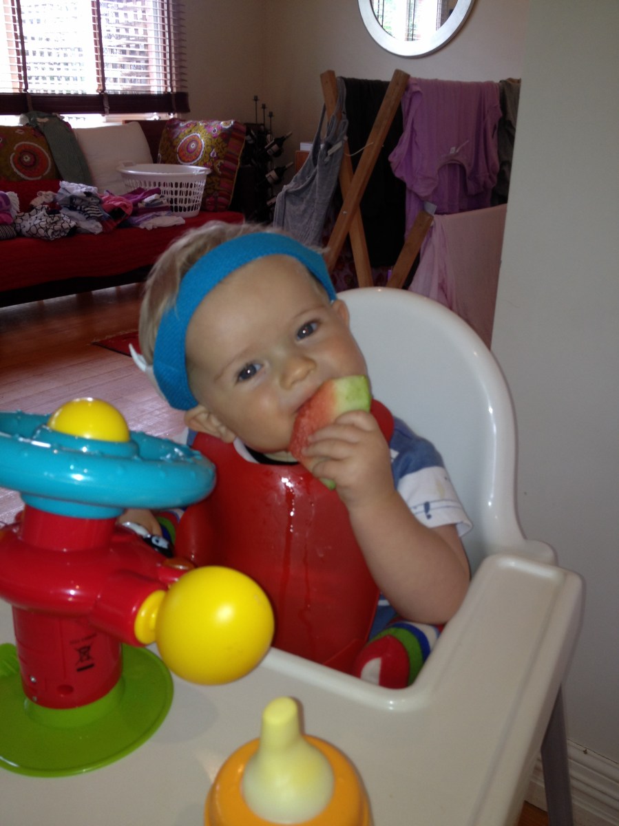 After a long sleep Harry sports his CI in the Joy Band at lunch